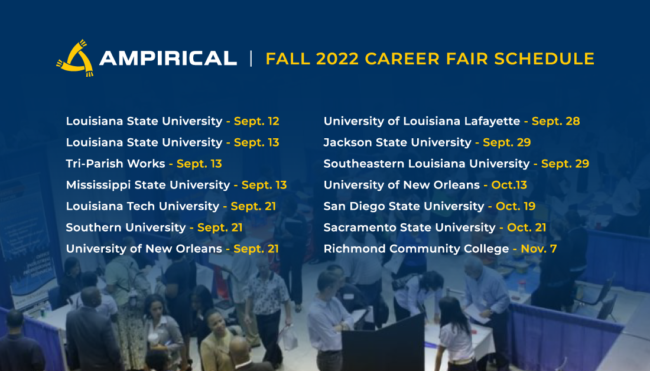 Ampirical Gearing Up for Fall 2022 Career Fairs NewsBy adminSeptember 8, 2022Ampirical set to attend 14 career fairs this fall.